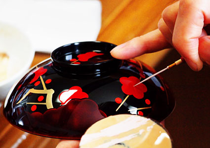 MAKI-E,The Finishing Sparkles on Lacquerware. Typical examples of lacquerware were ones with finishing called MAKI-E. It is a traditional Japanese technique of gilding, to draw three-dimensional pictures and designs on a lacquered surface. Only meticulousness of the finest craftsmen can create this work of art, by portraying classical motifs in lacquer on a pre-coated model and sprinkling gold and silver leaf on top. This beauty of Japan has been fascinating people all over the world, including Maria Theresa of the Habsburg dominions and her daughter Marie Antoinette. The two celebrities were so passionate that they set an entire room full of lacquered luxuries in the Schönbrunn Palace and the Palace of Versailles respectively. Maria Theresa even preferred lacquerware to "everything in the world, all diamonds." They referred to lacquereware as "Japan," after respect and admiration for the glorious country of the Far East.