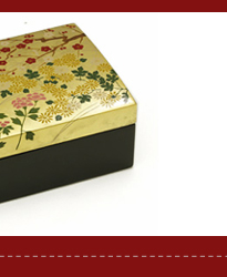 D rawn by using maki-e techniques, each flower represents different seasons: ume (plums) in the spring, botan (peonies) in the summer, kiku (chrysanthemums) in the autumn, and tessen (clematis) in the winter. The gold lid is coated with hon-kinpaku, or pure gold leaf, to create a luxurious mood. The velveteen lining inside will protect its contents from being scratched. <Naga-kobako Kinpaku Shiki Soka> Heiando Size (cm) : 18.5 * 12 * 7 Material : Wood, velveteen (lining) Quality : Urethane URUSHI (lacquer), KINPAKU (gold leaf) Note : Shipping with kibako (wooden box) More Information